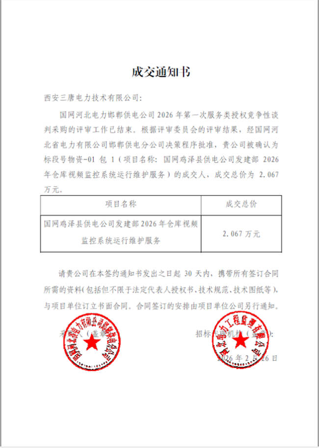热烈祝贺我司中标“国网鸡泽县供电公司发建部2026年仓库视频监控系统运行维护服务”